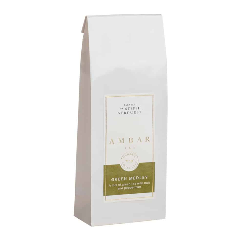 Deze mix combineert de goede eigenschappen van groene en witte thee. Het resultaat is een frisse energieboost . De theebladeren hebben Chinese roots en worden vergezeld van zachte fruittinten en een ondertoon van frisse munt, wat resulteert in een verkwikkend kopje dat je de ganse dag door kan drinken. Unieke smaken die veel harten weten te veroveren. Deze Green Medley is een theeblend van de AMBAR theelijn van theesommelier Steffi Vertriest.