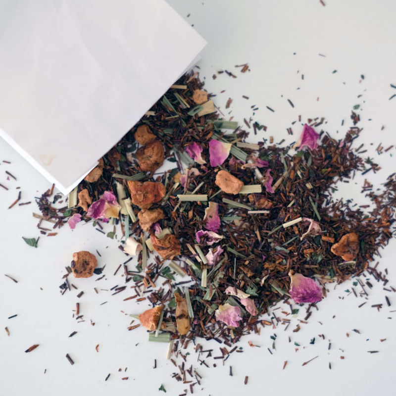 Ingrediënten: Rooibos, appelstukjes, citroengras, natuurlijk aroma, pepermunt, roze rozenblaadjes.