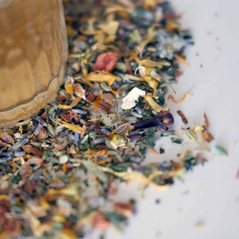 Ingrediënten: venkelzaad, sinaasappelschil, appelstukjes, kaneelstukjes, kamille, gemberstukjes, lavendelbloemen, brandnetelblaadjes, goudsbloemen, hele kruidnagel, frambozenblaadjes.