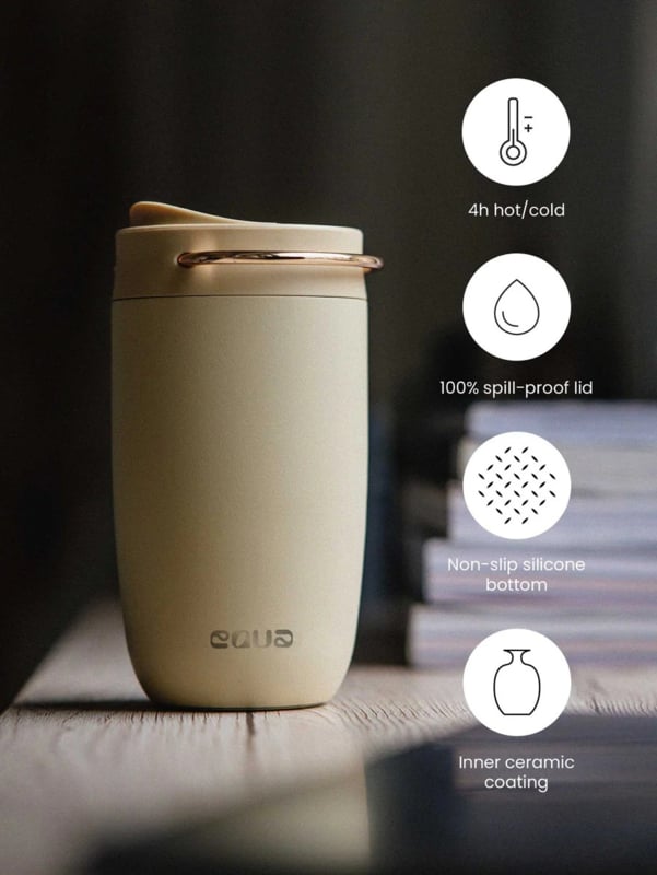Deze prachtige koffiebeker van Equa is super handig voor je ochtend koffie on the go of voor andere drankjes. Het heeft een keramische binnencoting en dit zorgt voor een betere smaak van je favoriete drank. Het heeft een ijzeren handvat, dus heel gemakkelijk om te dragen.