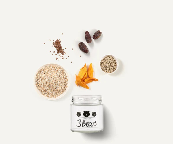 - Overnight oats mix van haver, fruitige mango, dadels, lijnzaad en zonnebloempitten.